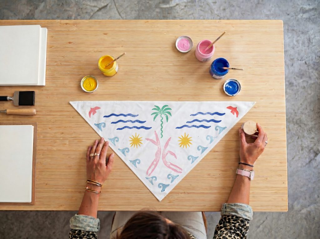 Personnalisez votre bandana en coton naturel ! Un grand tampon représentant une nageuse servira de visuel commun, tandis que de petits tampons et un jeu de lettres permettront de créer une composition unique avec un mot, un message ou un prénom. Sabrina Chess guidera les participant·es pour explorer le rythme, la répétition et le mouvement.