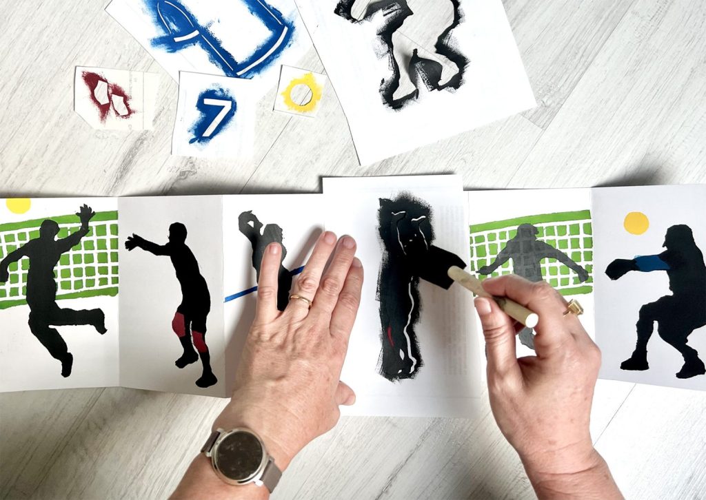 Cet atelier consiste à réaliser un leporello (petit livre accordéon) contenant des silhouettes de joueur.euse de volley en pleine action. Ajoutez à votre guise des accessoires liés au volley-ball : ballons, protections, filets… à l’aide des pochoirs ! Tamponnez la surface vide de peinture pour structurer l’espace autour du joueur.euse et amplifier le mouvement de son action. Un atelier pour créer votre propre jeu et votre propre joueur.euse, constituer votre équipe et s'amuser !