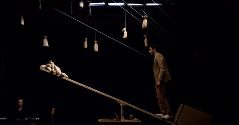 Dans une large palette de beiges composée de cartons, de cordes, de bois et de poids déambule la silhouette aussi fébrile qu’agile de Marc Oosterhoff. Entre danse et cirque, sa performance semble déjouer les lois de l’apesanteur, nous défiant de comprendre tout ce monde en suspens.